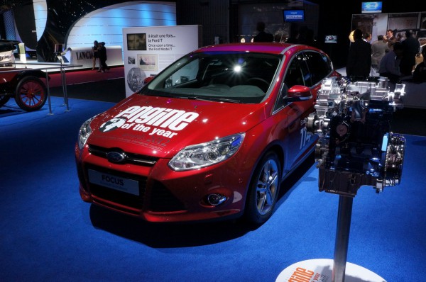 Ford Focus Titanium с литровым двигателем EcoBoost, который был назван "двигателем года" (International Engine of the Year). Двигатель действительно очень интересный и получил кучу наград - вон его модель, на стенде правее. Очень компактный, с мощностью в 100 л.с. (это на литре объема), также есть модель со 125 л.с. Тратит 4,8-5 литров на 100 километров.