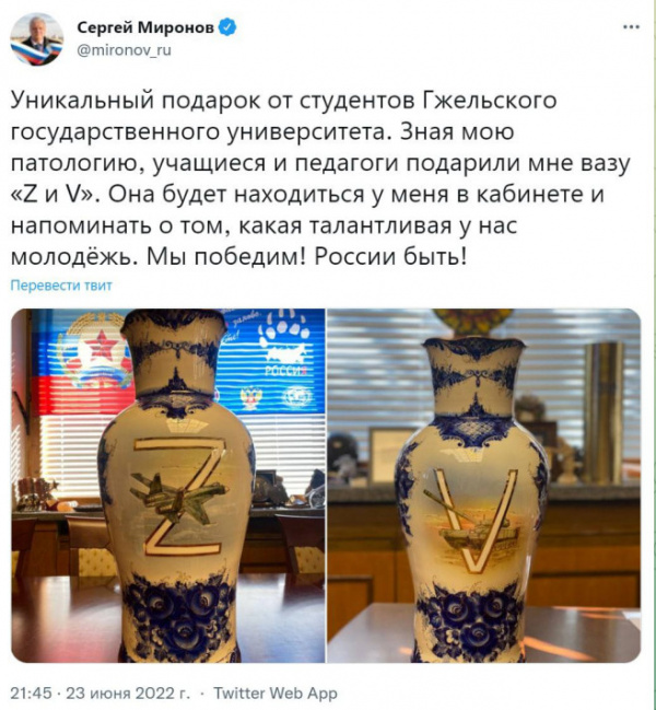 Пусть этот фашист Миронов поинтересуется, что случилось с обладателем вот этого подарка на фото, так похожего на его вазы.