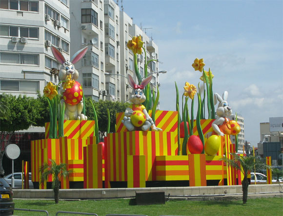 В Лимассоле обнаружились вот такие вот прикольные пасхальные зайцы. Мы хотели возложить к ним цветы, но цветов поблизости не было, поэтому мы ограничились банкой пива. Почти полной.