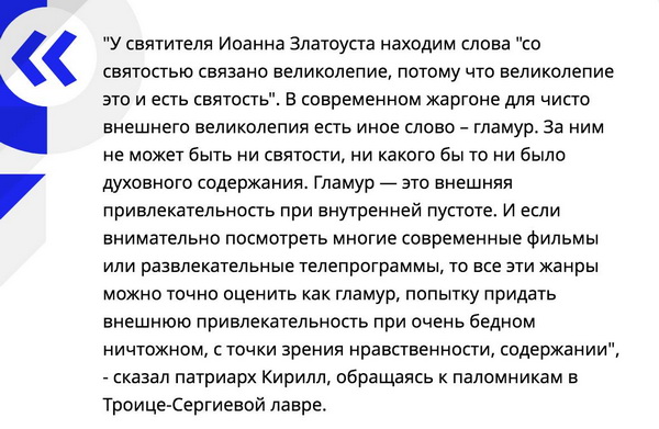 Алекс, патриарх имел в виду тот гламур, где элементы роскоши выставляются нарочито на показ. Одно дело, когда фотки этого выкидывают всякие тролли, другое, сами гламурята. И о том, что происходит подмена понятий важных в русской культуре слов.
