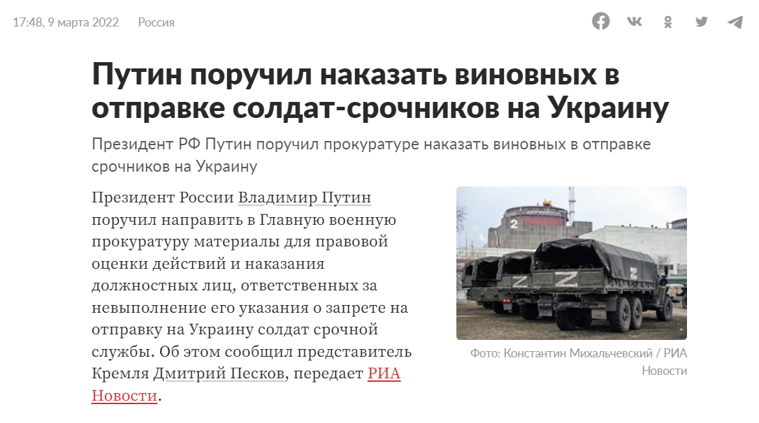 Как сообщил официальный представитель Минобороны России генерал-майор Игорь Конашенков, в частях российских вооруженных сил, участвующих в войне России против Украины, «к сожалению, обнаружились несколько фактов присутствия военнослужащих срочной службы».