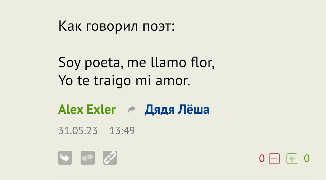 Ну и пародии на его стишата бывают забавные. Вот, например, Александр Ланин написал на вышепроцитированное: