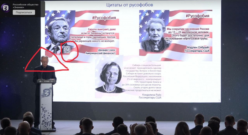 Патрушев на лекции “Знания” по привычке задвинул фейковые цитаты Сороса, Мадлен Олбрайт и Кондолизы Райс. Но в этот раз ПОКАЗАЛ ПРУФ (SIC!) СКРИНЫ ИЗ ПАБЛИКА В ВК, ОТКУДА ОН ВЗЯЛ ЦИТАТЫ, там даже QR-код паблика остался – он называется “НОД ZЛАТОУСТ”))