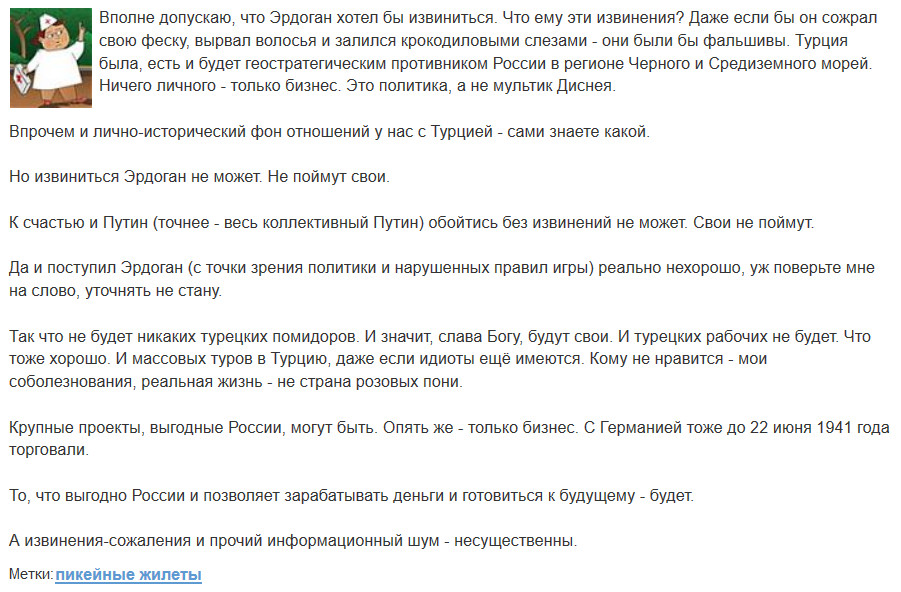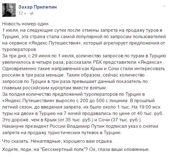 Так сказать, патриотично настроенные пейсатели и даже, что греха таить, большие государственники сильно переживают. Дерьмо у них народишко-то оказался. Пейсатели им столько времени растолковывали, какой невероятный враг вся эта туретчина и как, значить, хорошо, что теперь ни тебе помидоров, ни тебе строительства (с этим у них, кстати, промашка вышла, строительные контракты никто отменять не стал - себе дороже), ни, что самое главное, столь любимого оллинклюзива, потому что нехрен ездить к врагу, надо ездить в Крым, где, может, с сервисом на порядок хуже, но зато заметно дороже, так что стране - профит.