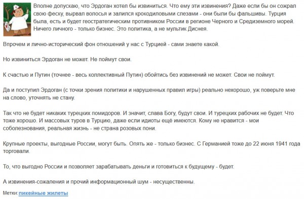 Но, впрочем, оба они впадают в опасную крамолу. Ведь у нас кто сказал, что с Турцией теперь - снова дружба навек и никакого запрещенного в Российской Федерации? Господин ПЖ сказал. Так чего теперь пейсатели-то выеживаются? Они на кого вообще наехали?