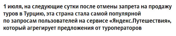 До последнего разворота официальных отношений с Турцией было у нас в прессе множество статей, где здлорадно и убедительно расписывалось, как в Турции теперь пустынно и как там все стало дешево (и все равно это им не помогает). Ну народ-то выводы сделал...