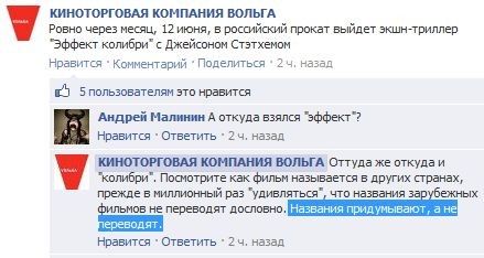 Во-первых, локализатор не соврал: названия действительно "придумывают", а не "переводят". Более того, это очень часто оправдано, и делается это далеко не только в России -- тут локализатор Вольга совершенно прав. Но ведь Вольга ничего не пишет о том, что в России это делают из рук вон плохо, правда? Не пишет. Так что в том, что пишет -- в том не ошибается. А то что довольно мало где к переводу относятся так же наплевательски, как у нас -- это уже другой вопрос. Но, опять-таки, не стоит разводить демагогию на тему "в этой стране", думать, что только у нас плохо, или что только у нас выдуманным названием пытаются "продать" фильм -- не только. Конечно, за какой-нибудь "Мой парень псих" (Silver Linings Playbook) надо казнить на медленном огне, но это другой вопрос.