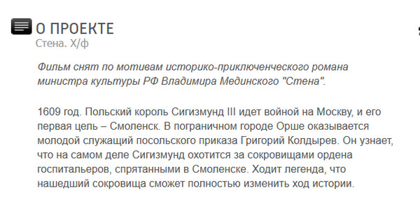 Это по зомбоящику, говорят, сегодня показали. По историко-приключенческому роману. Министра. Мединского. Стена.