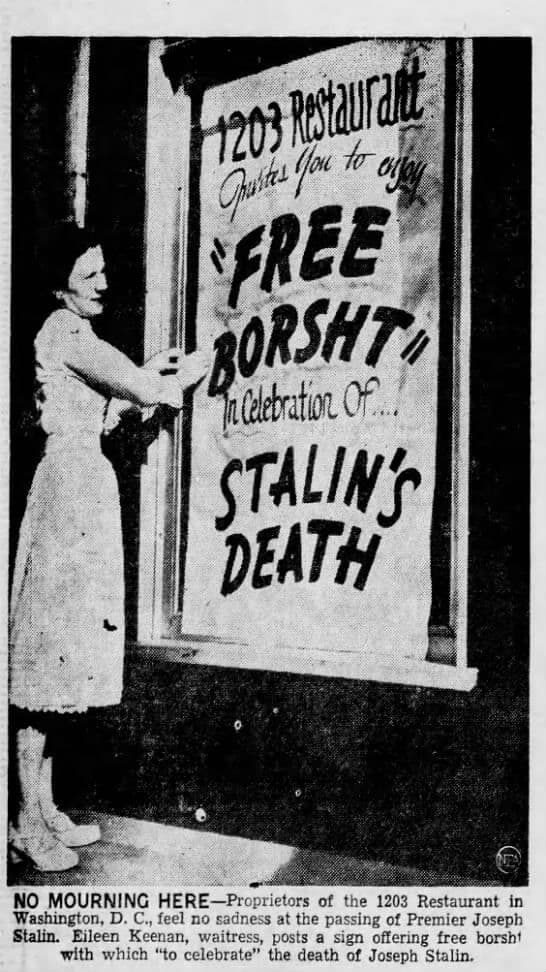 Вы, надо полагать, нелюбитель английского? Это плакат по случаю празднования сталинской смерти с раздачей бесплатного борща рестораном.
