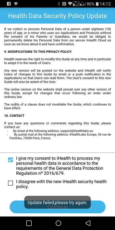 В моем личном рейтинге на первом месте приложение iGluco - это программа, работающая с глюкометром (устройством для измерения сахара в крови). Эти прекрасные люди выкатили предупреждение об изменениях, там надо было поставить галку и нажать кнопку. После нажатия программа выдает "Update failed, please try again" и работать отказывается. И так третий день. Пробовал через мобильную сеть, перезагружал смартфон - без толку, не работает.