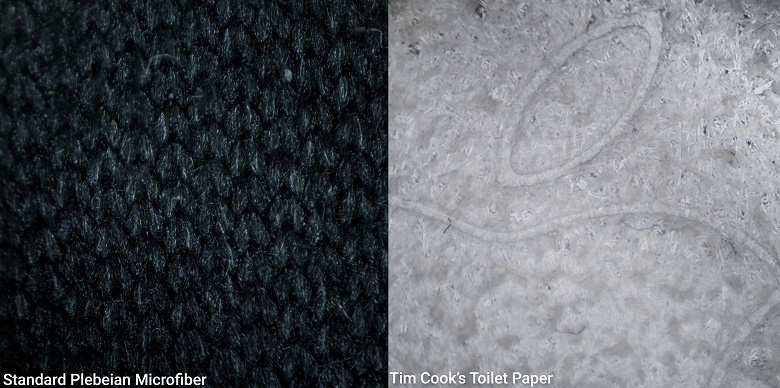 Изучая «яблочный» кусочек ткани, специалисты компании в шутку отметили, что если отделить слои друг от друга, то можно получить сразу две идентичные салфетки по цене одной. Кроме того, в iFixit рассмотрели салфетку и под микроскопом, обнаружив крошечные волокна, переплетённые друг с другом.
