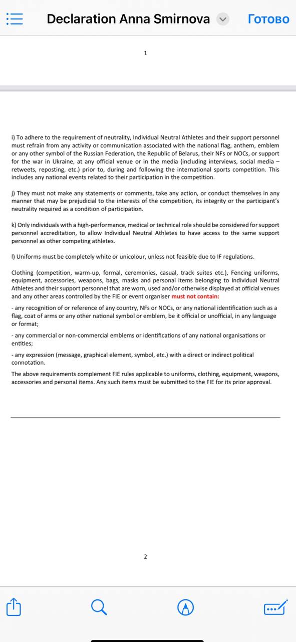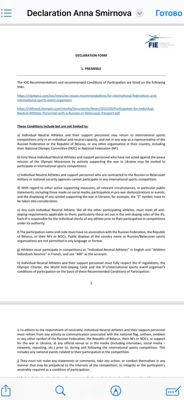 Но дальше стало совсем интересно. Дело в том что еще со времен коронавирусного дурдома существовало правило, которое разрешало не пожимать руки после поединка, а позволяло просто скрещивать опущенные сабли - что и пыталась сделать Ольга Харлан. И еще утром в день матча и Ольге, и ее тренеру руководство Международной федерации фехтования подтвердило, что это правило действует, и так поступать вполне правомочно. (Да и, собственно, на данном турнире были и другие спортсмены, которые именно так завершали поединок.) Об этом говорила и сама Ольга, и ее тренер. Более того, они утверждают, что Анна Смирнова и ее тренер были предупреждены о том, что после поединка вместо пожимания рук будет процедура скрещивания сабель.