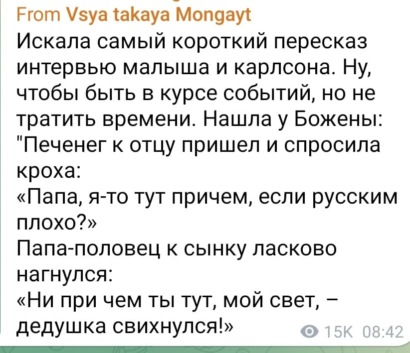 Про мирные переговоры, это укатайка, Шлосберг сказал, что Путину выгодно начать переговоры, поскольку в России страдает экономика и гибнут люди 🤦♂️ Да, Путин же так переживает, что гибнут люди и что страдает экономика, прям плачет по ночам в подушку. Особенно забавно это смотрится на фоне того, что Шлосберг обвинял кучу людей в тупости.