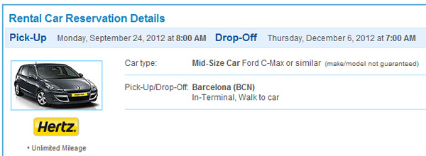 Посмотрел, что еще рекомендовали из подобных агрегаторов. Попробовал Priceline. Тот мне нашел очень даже интересное предложение - mid-size типа Ford C-Max на 73 дня за €1523, то есть по 20 евро в день. Причем это еще и в Hertz, который в данном случае удобен тем, что у него стойка и машины - прямо в аэропорту, не надо никуда ехать на шатле, как с тем же GoldenCar.
