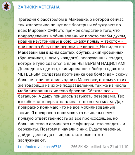 Издание отмечает, что вторая запись появилась 12 ноября в проукраинском телеграм-канале «Фашик Донецький». 13 ноября украинская администрация Луганской области сообщила об освобождении Макеевки. 16 ноября эту информацию подтвердило Минобороны Украины.