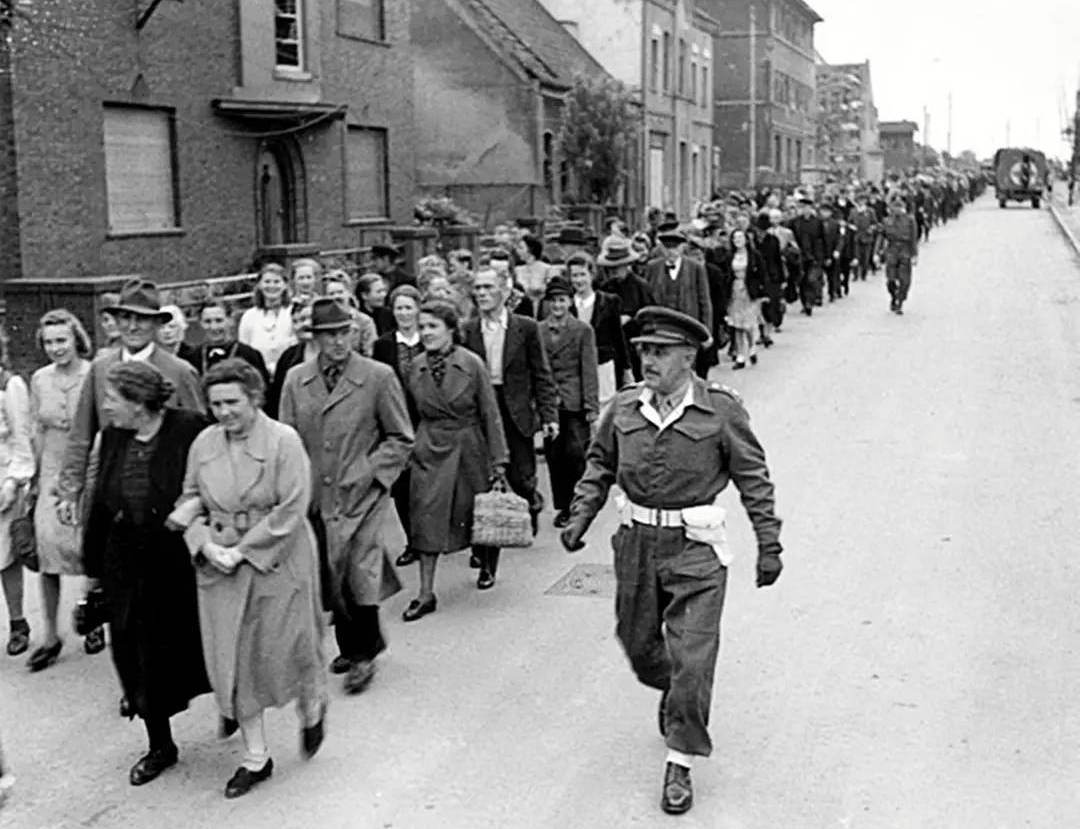 На снимке американские военные ведут немецких граждан на принудительный просмотр документальных фильмов о преступлениях нацистов.