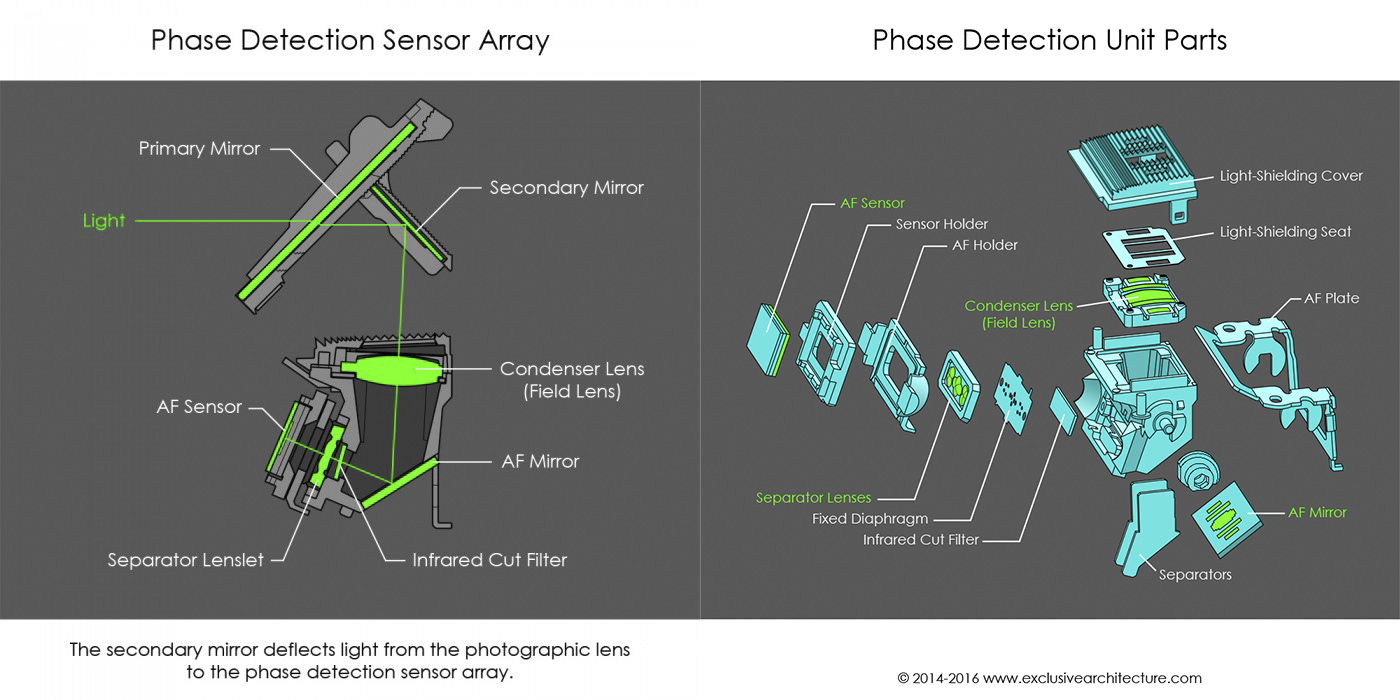 3. Массив АФ у зеркалки - это такой специальный блок фазовых датчиков, расположенный под зеркальным модулем, на который свет отражается специальным маленьким зеркальцем, и он собственно отвечает за измерение расстояний. При этом данный блок датчиков с той или иной степенью успеха стараются откалибровать, чтобы когда датчик (хотя бы центральный) сообщает, что объект в фокусе, то он должен быть на самом деле в фокусе на поверхности матрицы. Удается это не всегда, особенно для точек, отличных от центральной. И отдельная тема - выравнивание этого массива с точками АФ в видоискателе, которые находятся совершенно в другом месте. Картинки в помощь (отсюда).