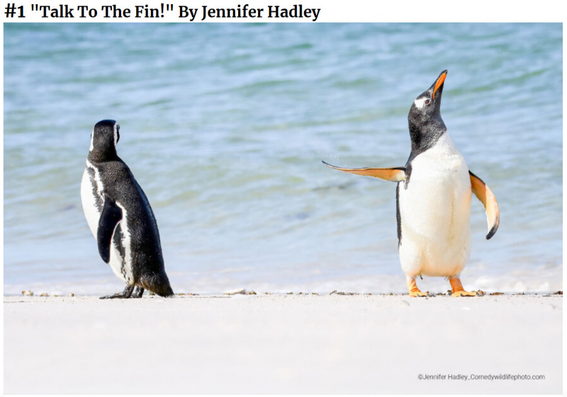 Снимок был сделан на Фолклендских островах. Эти два пингвина-генту тусовались на пляже, когда один из них отряхнулся и типа как дал отпор своему товарищу.
