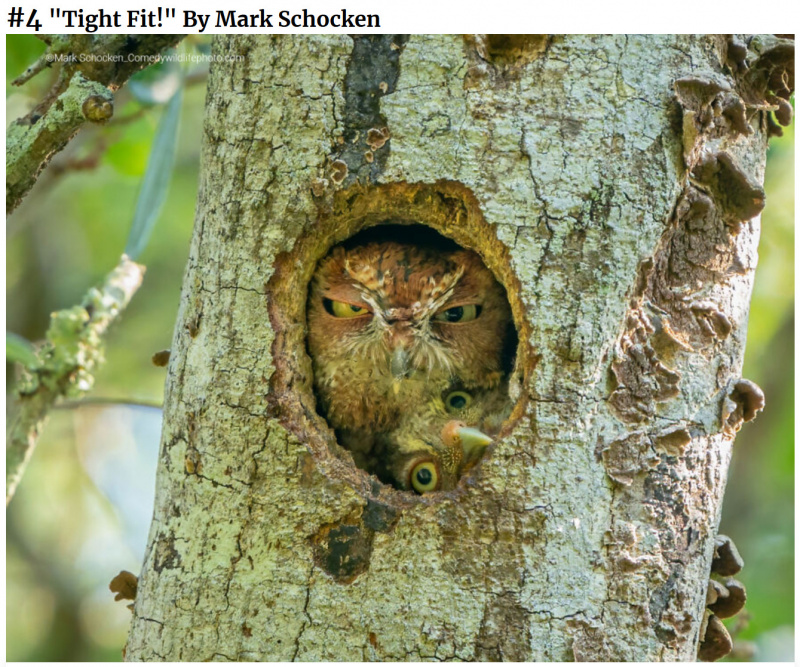 Я собирался увидеть и сфотографировать гнездо восточного скрипуна в местном парке во Флориде. Однажды утром, за несколько дней до того, как два совенка оперились, один из них попытался протиснуться в гнездовое отверстие вместе с мамой - возможно, чтобы впервые увидеть внешний мир. Это было уморительно, и я был рад, что оказался там в то утро, чтобы сфотографировать это. Этот момент длился всего несколько секунд, так как мама, похоже, была не очень довольна таким раскладом. Посмотрите на выражение ее лица.