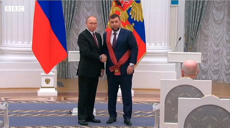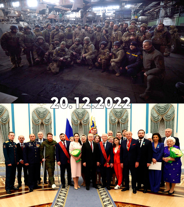 Но это было не вчера, а пару дней назад. Вчера Путин был занят совсем другими важными военными делами. Пока президент Зеленский на передовой вручал награды бойцам ВСУ, Путин на передовой в Екатерининском зале Кремля награждал всяких пасечников-сальдо-петушилиных и своих пропагандонов.