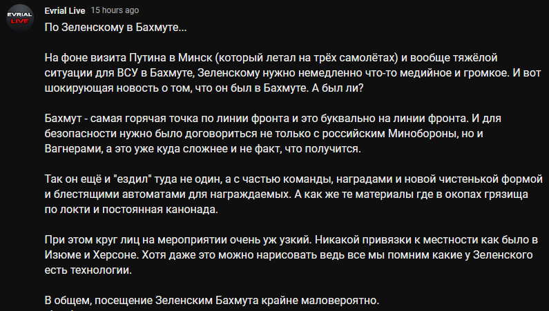 «Хороший информационный ход от Зеленского, который якобы был в Бахмуте на фоне того, что там идёт полная мясорубка. Был ли он там или не был, никто особо не узнает. Жаль, что все данную информацию восприняли за чистую монету» - написал Telegram-канал Легитимный. Там также предположили, что Зеленский мог посетить Донецкую область, а специалисты по пиару решили, что называется, «дорисовать».