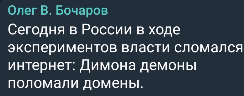 Они не только DNS сломали, но и телегу тоже - у меня сегодня разорвался видеозвонок, а повторные попытки позвонить обламывались на этапе обмена ключами. Не первый раз уже такое случается. 🤬