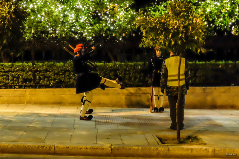 Вот это парад, это я понимаю (я про ролик, а не про фото ниже)! Лихо, задорно, зрелищно, весело! Понятия не имею, где это и что, но по одежде и вычурным движениям по крайней мере первая колонна напоминает греческий почетный караул в Афинах - см. фото.