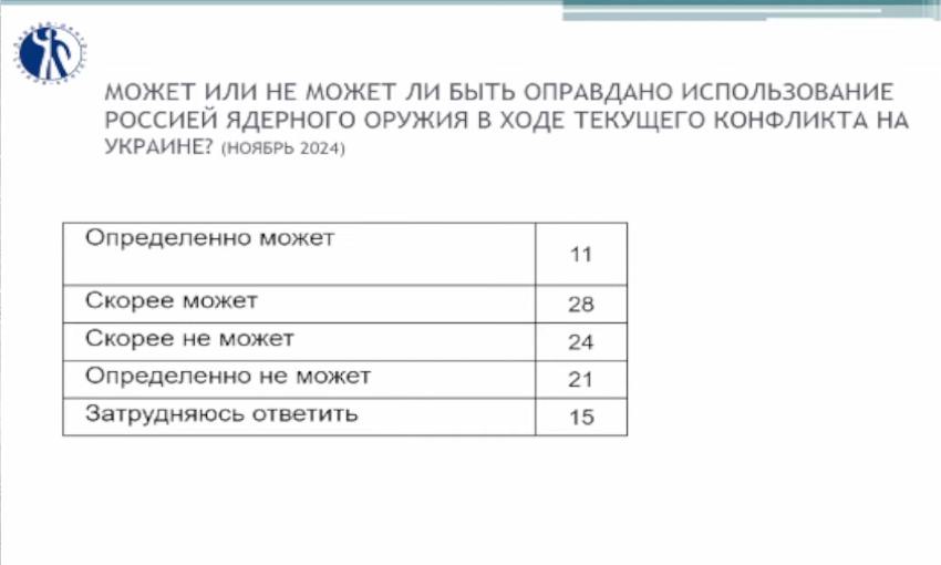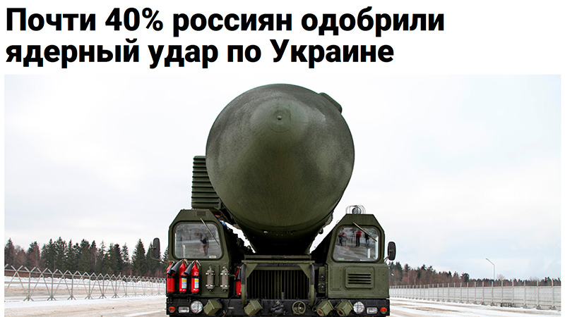 «Определенно» поддерживают ядерный удар по Украине 11% россиян. Еще 28% склоняются к тому, что такой шаг «скорее может быть оправданным». Это новый рекорд с начала войны.