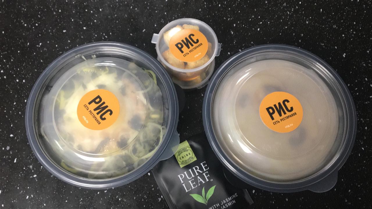 Привет из российской провинции. Самоизоляция, дождь. Надоела домашняя еда, заказал бизнес-ланч. По пятницам в Рисе восточный обед: суп Том-Ям, мексиканский салат и удон с курицей и овощами. Ещё и пакетик с хорошим чаем. Они сохранили бизнес-ланчи с 12 до 17 часов по будням. Доставили точно по времени, теплое. Заплатил 299 рубля ($4). А доставка бесплатная Только позвони прямо в ресторан, без посредников. Я доволен, деньги то тают. Накинулся на обед как с голодного края. Понял, что очень соскучился по хорошей ресторанной еде. Понравилась посуда для доставки, приятно прямо из неё обедать.