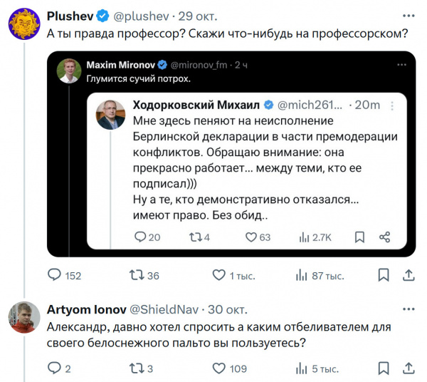 Сначала написал Ходорковский.Его репостнул Миронов со своим комментарием.Миронова репостнул Плюшев со своим комментарием.Плюшеву ответил Ионов без репоста.