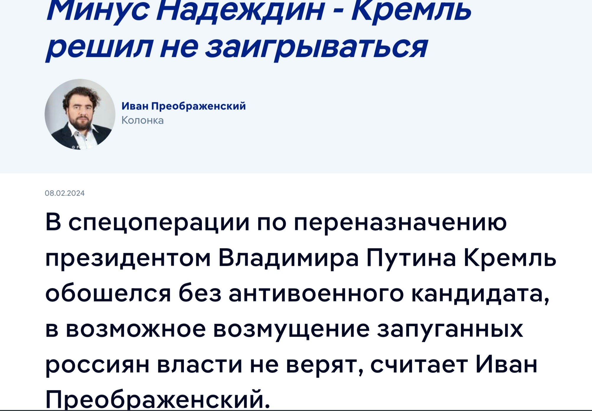 Зачем они это делали - лично я, честно говоря, не понимаю. Потому что с Надеждиным могло быть только два варианта. Первый - это назначенный кремлевской администрацией спойлер, который будет играть свою роль - будет показывать минимальную поддержку типа как противника СВО. ("Путин совершил серьезную ошибку, начав СВО, - заявил Надеждин, - потому что ни одна из поставленных целей СВО до сих пор не выполнена".) Если он эту роль играет так, как полагается, то его сначала регистрируют в кандидаты, дают собрать подписи, регистрируют подписи, найдя минимальный процент ошибок, после чего допускают до выборов, где он получает свой минимальный процентик.