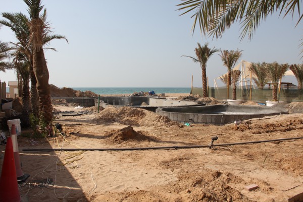 Шезлонги, зонтики, песок. Между жезлонгами и заливом - довольно большая песчаная зона. С купанием тут точно не фонтан - это все-таки Персидский залив, а не Средиземное море. Залив мелкий, очень сильно нагревается, на дне немало камней. Так что по поводу купания народ предпочитает колбаситься в бассейне.
