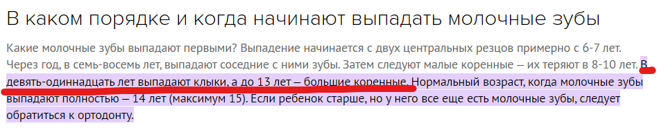 А можно просто набрать в гугле "когда выпадают молочные зубы", посмотреть первые пять, десять, двадцать ссылок и убедиться наконец, что возраст 10-12 лет попадает в интервал смены зубов у современного человека чуть менее чем всегда. Независимо от используемой терминологии.