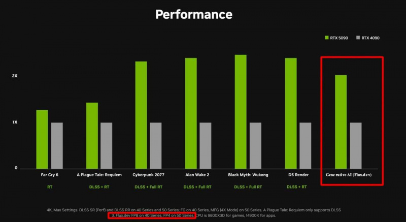 Интересный момент: RTX 4090 тестировали с FP8 (8-бит), а RTX 5090 с FP4 (4-бита), требующим вдвое меньше памяти