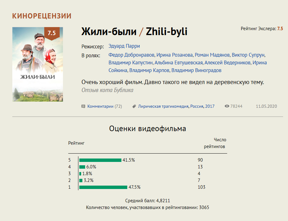 Или вот лучший фильм по рейтингу читателей, я так понимаю читатели настолько офигели увидев, что он лучший по их мнению, что наставили единиц, но не помогло.