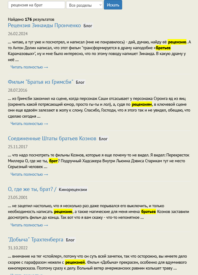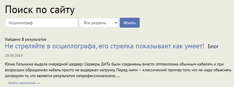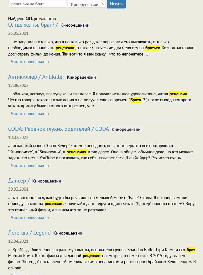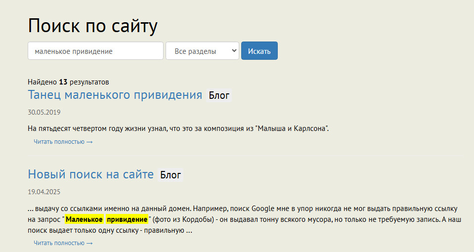 В новом поиске по сайту благодаря вашим комментам выловили несколько косяков и исправили. Также включили в поиск отдельную базу заголовков статей (до этого по заголовкам не искало) и для заголовков вес для поиска увеличили.