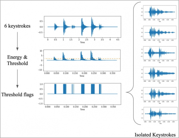 В статье подробно пишется о том, как это все делалось. Исследователи собирали данные, нажимая 36 клавиш на современном MacBook Pro по 25 раз и записывая звук, издаваемый при каждом нажатии. Затем из записей были получены осциллограммы и спектрограммы, на которых визуализировались различия для каждой клавиши.