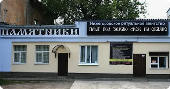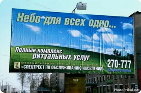 Это не черный юмор, а какой-то пошлый цинизм. Настоящий черный юмор обычно подразумевает отстранённость от явления как у его автора, так и у потребителя. Бывает ещё черный юмор как защитная реакция, но похоронная контора никак не страдает от смерти, в отличие от её клиентов.