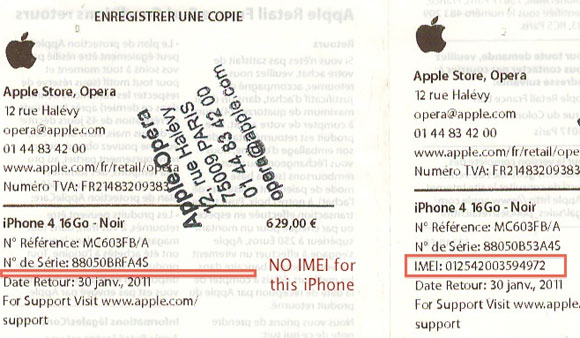 Неделю назад помогал своему не совсем англоязычному товарищу в аналогичной ситуации - были привезены два телефона из Канады. В одном чеке отсутствует IMEI. Позвонил в Apple Store, где был послан девочкой-продавцом в центральный Apple Care (в народе именуемый customer support). Видимо была какая-то техническая неполадка, потому что не мог дозвониться дня два.