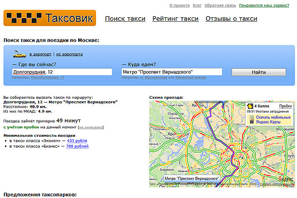 Сервис при заказе такси по Москве - "Таксовик". Вводите пункт отправления (улица, дом; станция метро) и пункт назначения (улица, дом; станция метро). Программа вычисляет маршрут, примерное время в дороге с учетом пробок (карта прилагается) и среднюю стоимость эконом- и бизнескласса. Далее по ссылке эконом или бизнеса попадаете на соответствующий длинный список служб такси, по каждой из которых приводятся всякие особенности тарификации и можно почитать отзывы.