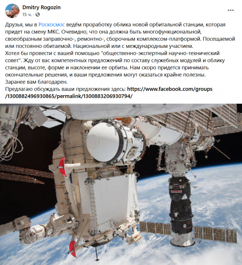 Рогозин в своем Facebook призвал диванных экспертов присылать ему компетентные предложения по облику новой орбитальной станции.