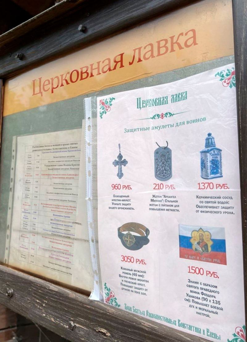 В ценнике ошибка, которую попы обычно не допускают (как правильно - церковь освЕщена свечами; крестик освЯщен в церкви). Да и амулетом нательный крестик они бы не назвали.