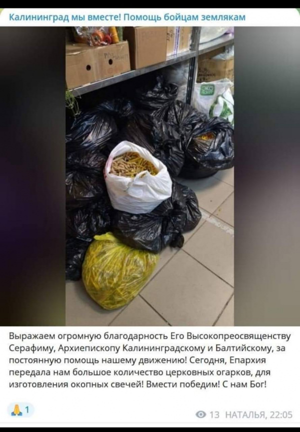 Попы расщедрились на огарки для солдат. Между тем, огарки - это остатки свечей, которые люди в церковь ставят Богу за упокой души своих близких или за здравие своих близких. И вот, например, я, верующий православный (для примера, конечно, я никакой не верующий), прихожу в церковь, чтобы поставить свечку за упокой души близкого родственника, а потом остаток этой свечки попы передадут путинским оркам, которые оккупировали часть территории Украины, воюют с украинской армией, пытают, насилуют и убивают мирных жителей Украины. И эти путинские орки в окопах будут использовать мою свечку, которую я купил и поставил за упокой души близкого родственника.