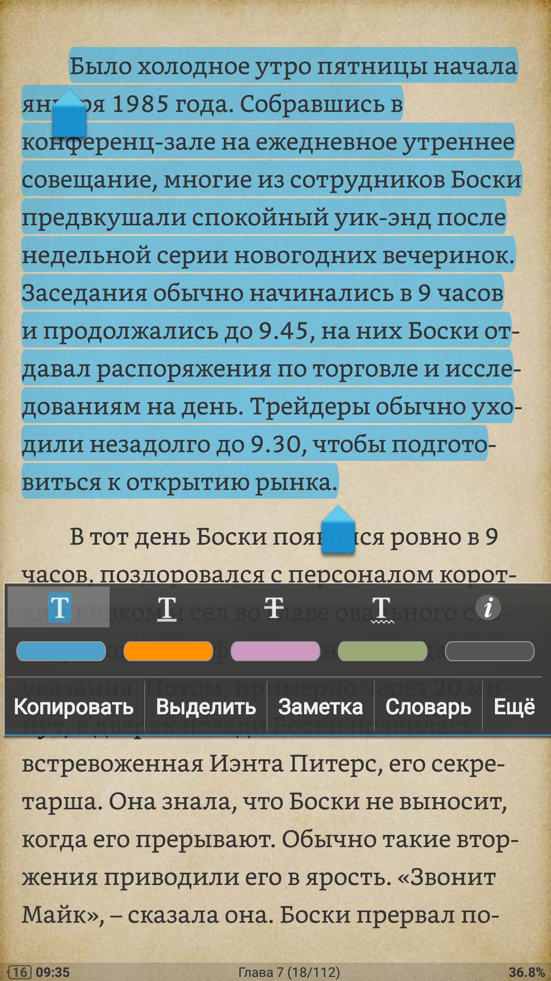Поставил ReadEra - он довольно простой и при этом достаточно удобный, однако умеет только ставить закладки, вот сохранять выделенный блок текста - не умеет, а мне это нужно. Ну и раздражает, что при нажатии на книгу сначала попадаешь на страницу "О документе" (вот на черта?!!) и для входа в текст надо нажимать кнопку "Читать".