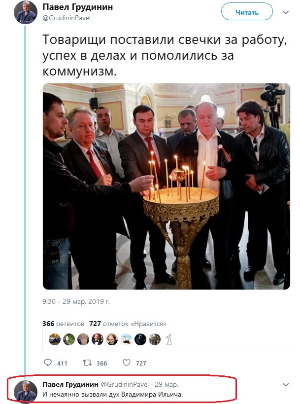 У каждой знаменитости в твиттере есть фейковый аккаунт. "Грудинин" в реплае к этому твиту пишет, что товарищи случайно вызвали дух Ильича.А фото действительно смешное.