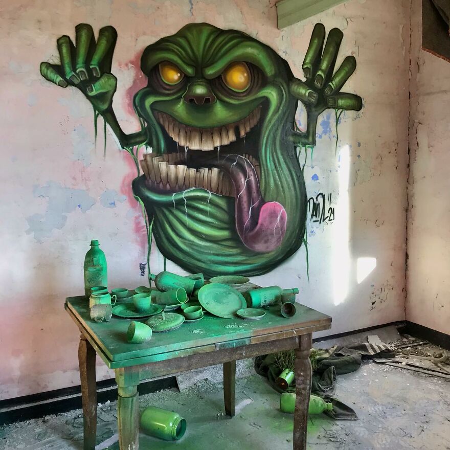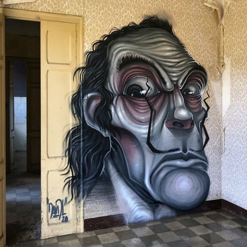 Барселонский художник Давид Лосано (David Lozano) рисует впечатляющие граффити, изображающие разнообразных известных киноперсонажей, в заброшенных зданиях города. Причем он не просто рисует граффити, он их еще и искусно встраивает в помещение и делает там соответствующие инсталляции.