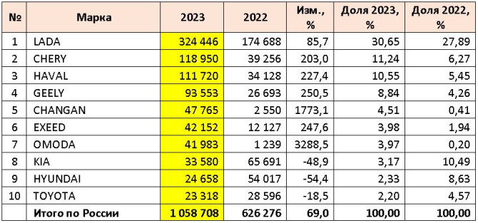лидером рынка осталась отечественная LADA, результат которой составил 324,4 тыс. единиц. Второе место и лидерство среди иномарок завоевала китайская Chery (119 тыс. шт.). Замкнул первую тройку китайский бренд Haval (111,7 тыс. шт.).