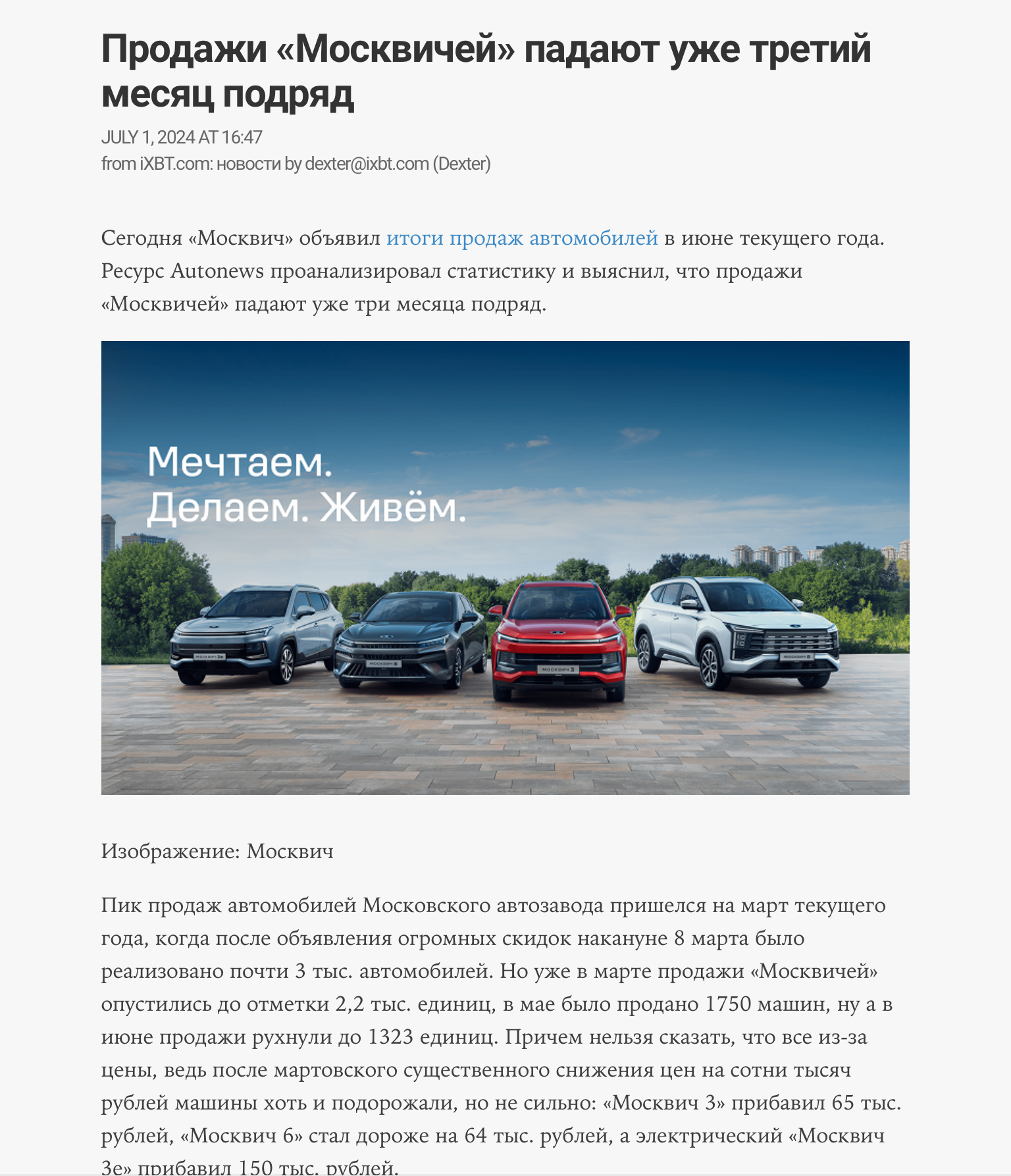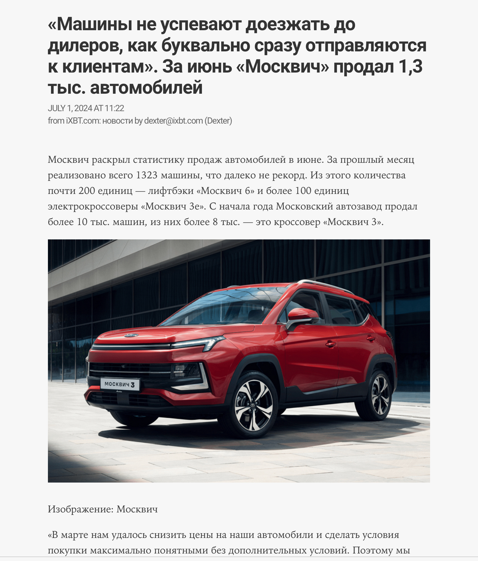 При этом мы знаем, что "обновленный Москвич" - это китайские модели, которые в РФ изначально продаются раза в два-три дороже, чем их отпускная цена в Китае.