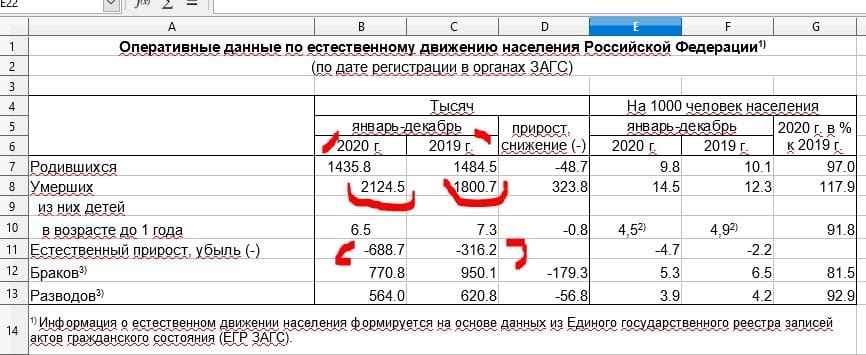 Они с ума сошли. Россия стремительно вымирает последние 10 месяцев. Декабрь 2020 и январь 2021 поставили рекорд убыли населения с Войны. - 700 тысяч в 2020 и будет -1.3 млн в 2021 году. Только тогда это были фашисты и голод, а сейчас непонятно отчего умирают. Избыточная смерность с апреля 2020 по февраль 2021 года 475 тысяч человек.С 2019 годом сравниваться не стоит, поскольку в 2019 была зафиксирована самая низкая смертность начиная с 1992 г. Смертность просто вернулась к значениям до 2011 года. В 2010 г. умерло 2028 тысяч человек, в 2005 г. - 2304 тыс., в 2000 г. - 2225 тыс. И это без Крыма. А вот при Совке в 1990 году умерло всего 1656 тыс. человек за год. А рекорды были в 1994 и 2003 годах - более 2.3 млн. человек.