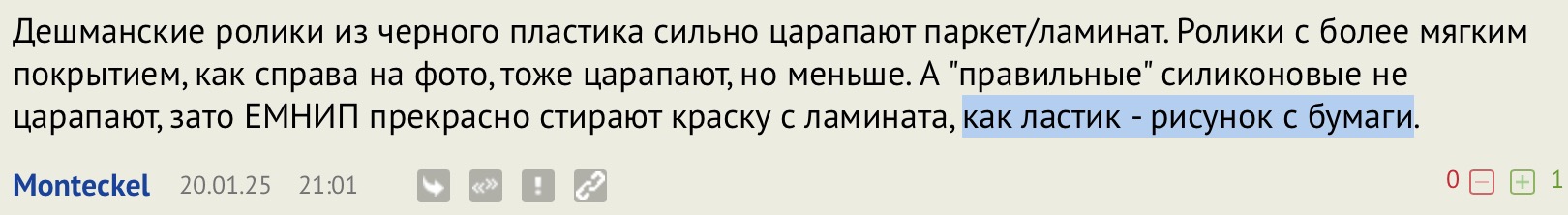Дешманские ролики из черного пластика сильно царапают паркет/ламинат. Ролики с более мягким покрытием, как справа на фото, тоже царапают, но меньше. А "правильные" силиконовые не царапают, зато ЕМНИП прекрасно стирают краску с ламината, как ластик - рисунок с бумаги.